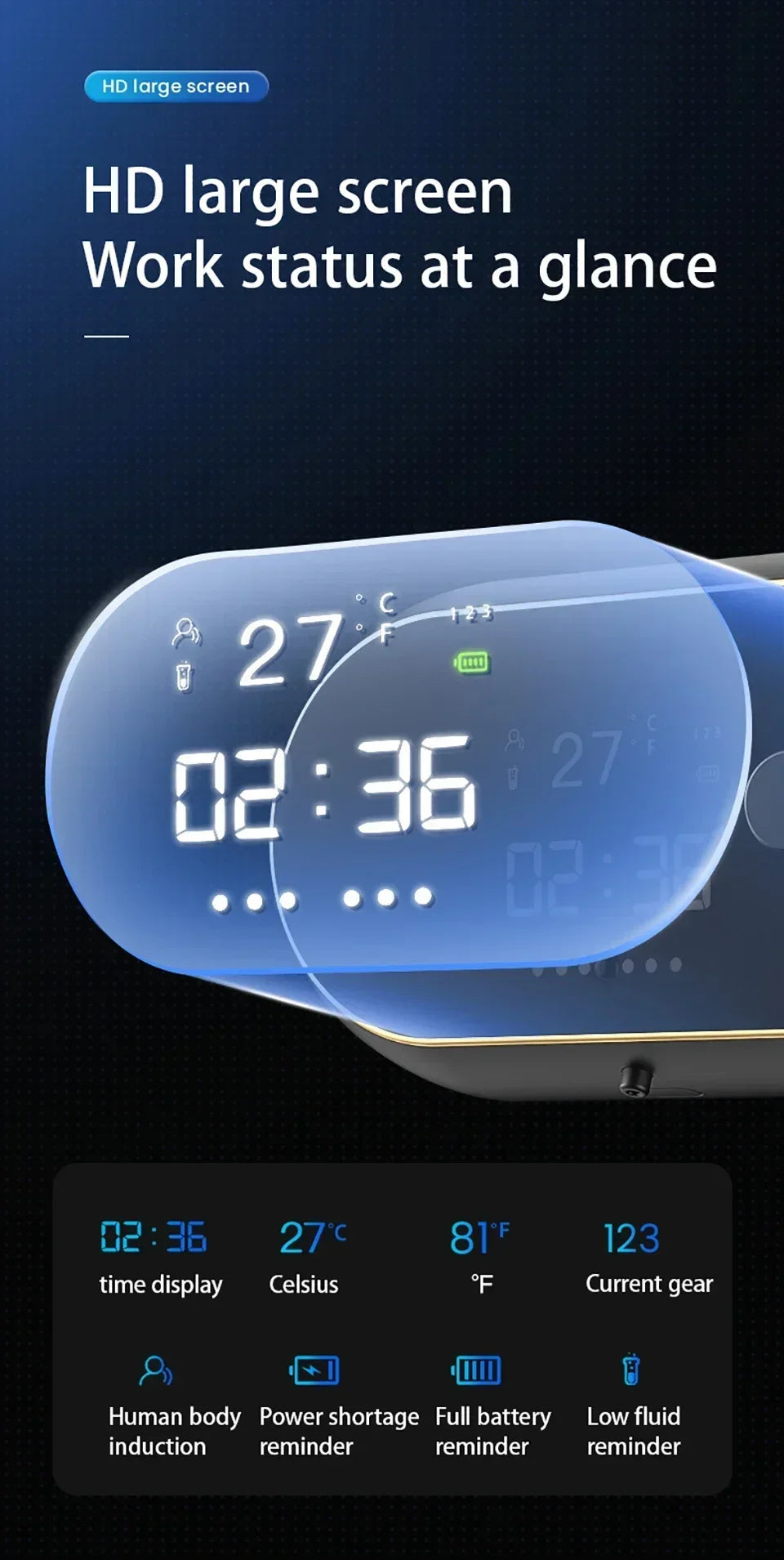 [Ideal design] Three gear adjustment of foam volume can meet the different needs of adults and children in 0.6s, 1s and 1.5s. It can display the remaining battery and indoor temperature in full screen.